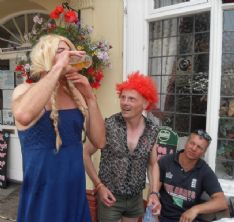 I mentioned earlier that the race has a bit of a reputation. This was immediately brought home to all those taking part as the next pub had some dreadful concoction on offer. By the time they had got to the 4th pub they were in second place and looking very strong. The route takes them from one end of the town to the other taking in a total of 14 pubs. They went down the steps in to the Cellars Bar (no easy task when you're tied up at the ankle) in first place but came out a minute later in second place. The panic/look of horror as they headed on to the next pub was a sight to be seen! What the heck had gone on down there?... Was Monkeys and the Trotters proud record finally going to go up in a puff of smoke.