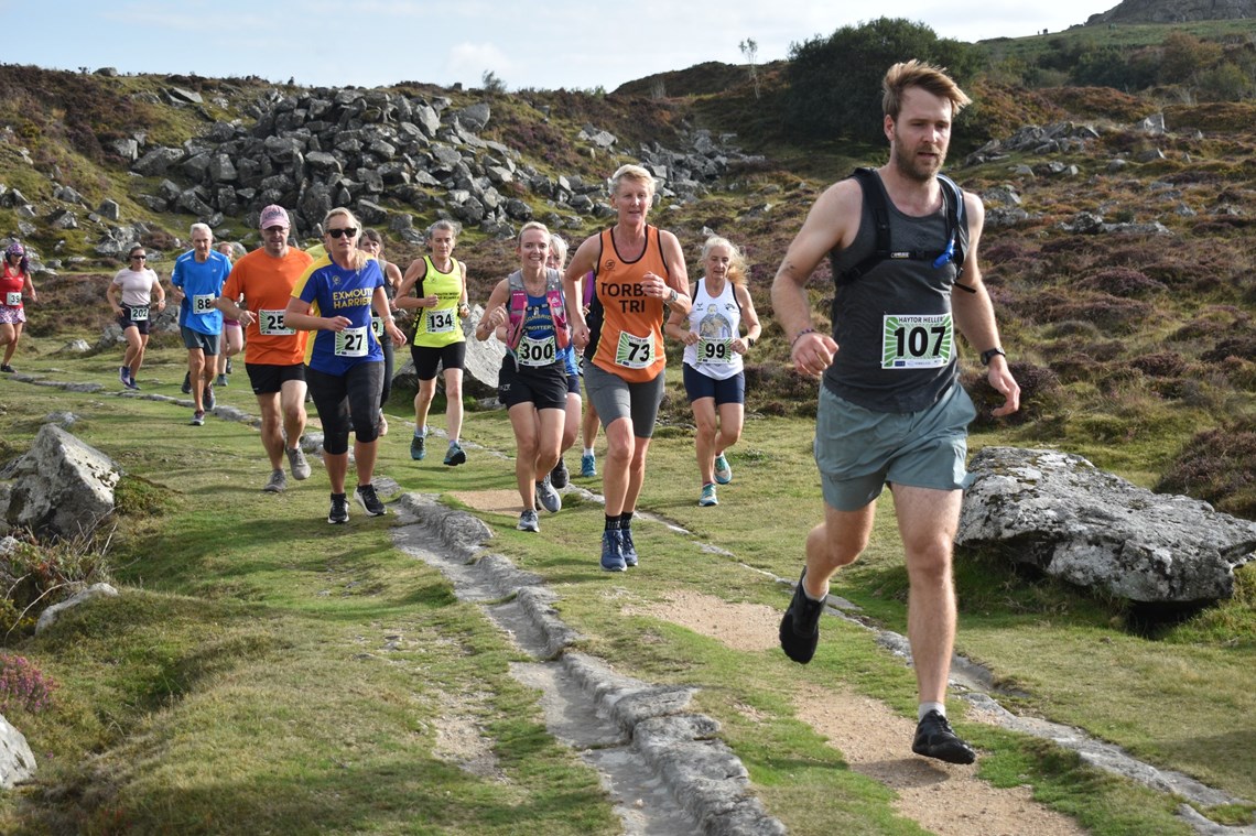 This popular, well established moorland race, now in its 40th year, starts below Haytor Rock and follows a hilly, single lap route before returning once again to Haytor Rock with a fast downhill scamper to the finish opposite the middle car park at Haytor. The course is approximately 6 miles and is challenging, with several steep ascents and descents and is generally run across rugged, open moorland (apart from two sections through woodland; firstly below Hound Tor and secondly below Haytor) and includes a stream crossing.